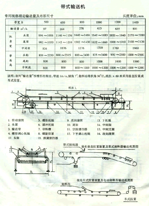 帶式輸送機(jī)是一種輸送量大、運(yùn)轉(zhuǎn)費(fèi)用低、適用范圍廣的輸送設(shè)備。按其支架結(jié)構(gòu)固定式和移動式兩種;按輸送帶材料有膠帶、塑料帶和鋼帶之分。目前以膠帶輸送機(jī)使用最廣;塑料帶是一種新型材料,使用日漸增多;鋼帶主要用于高物料。輸送機(jī)的工作環(huán)境溫度一般在-10∽+40°之間,其傾斜角最大不超過30°,要求物料溫度不超過70℃;耐熱橡膠帶輸送120℃以下的高溫物料。物料溫度更高時不宜采用膠帶輸送機(jī)。當(dāng)輸送具有酸性、堿性、油類物質(zhì)和有機(jī)熔劑等成份的物料時,需采用耐油、耐酸堿的橡膠帶或塑料帶。